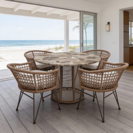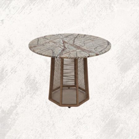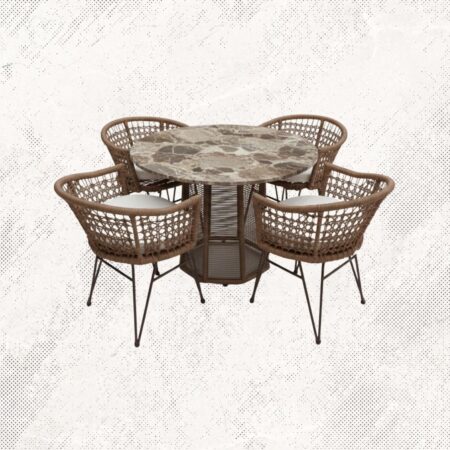 Materiales: Mesa redonda para 4 sillas, con estructura de aluminio tejida con rejilla sintética y cubierta de piedra.