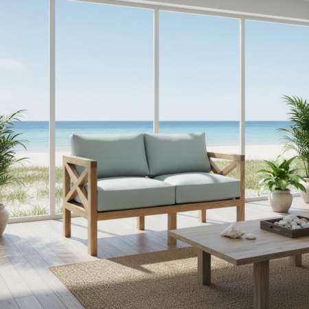 Materiales: Sofá con estructura de madera, cojinería fabricada con hule espuma de alta densidad y tela resistente al sol y la intemperie.