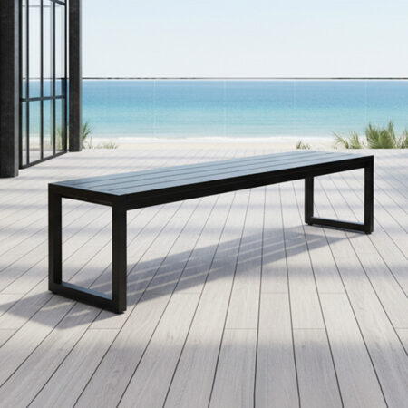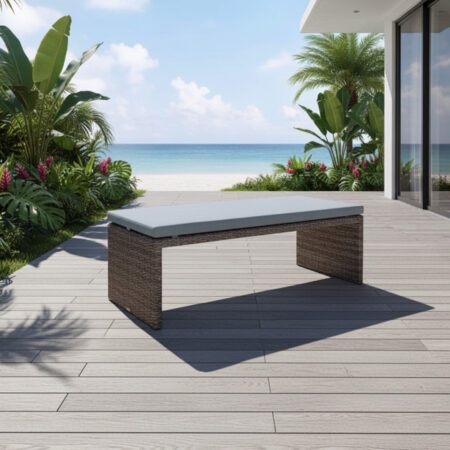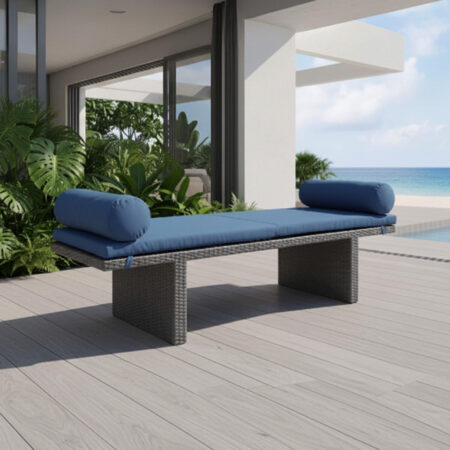 Materiales: Estructura de aluminio, base de madera, tejido con rejilla sintética de alta calidad, cojineria con espuma de alta densidad.